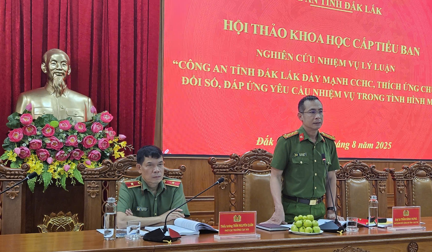 Phát biểu tại hội thảo, Đại tá Trần Bình Hưng - Phó Giám đốc Công an tỉnh Đắk Lắk cho biết, cải cách hành chính (CCHC) là nhiệm vụ trọng tâm, xuyên suốt, gắn liền với nhiệm vụ bảo vệ an ninh quốc gia, bảo đảm trật tự, an toàn xã hội. Công an tỉnh Đắk Lắk đã đạt được nhiều kết quả đáng ghi nhận, trở thành một trong những địa phương đi đầu cả nước trong việc triển khai bộ phận Một cửa giải quyết thủ tục hành chính nội bộ trên bốn lĩnh vực. Tỷ lệ hồ sơ cung cấp dịch vụ công trực tuyến trong những năm gần đây luôn đạt trên 97%. Đặc biệt, chỉ số CCHC của Công an tỉnh luôn đạt loại “Tốt” trở lên, trong đó Công an tỉnh Đắk Lắk cũ có 7 năm liền (2018-2024) xếp hạng “Xuất sắc” và đứng thứ hạng cao trong Công an các tỉnh, thành phố trực thuộc Trung ương.